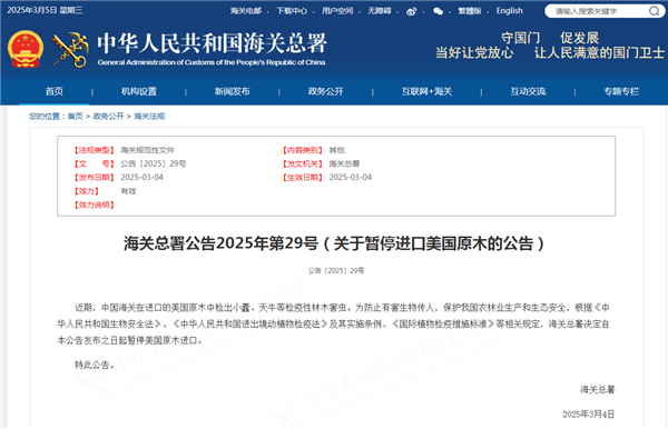 3月4日,海关总署发布公告称,近期,中国海关在进口的美国原木中检出小蠹、天牛等检疫性林木害虫。为防止有害生物传入,保护我国农林业生产和生态安全,根据《中华人民共和国生物安全法》《中华人民共和国进出境动植物检疫法》及其实施条例、国际植物检疫措施标准等相关规定,海关总署决定自本公告发布之日起暂停美国原木进口。