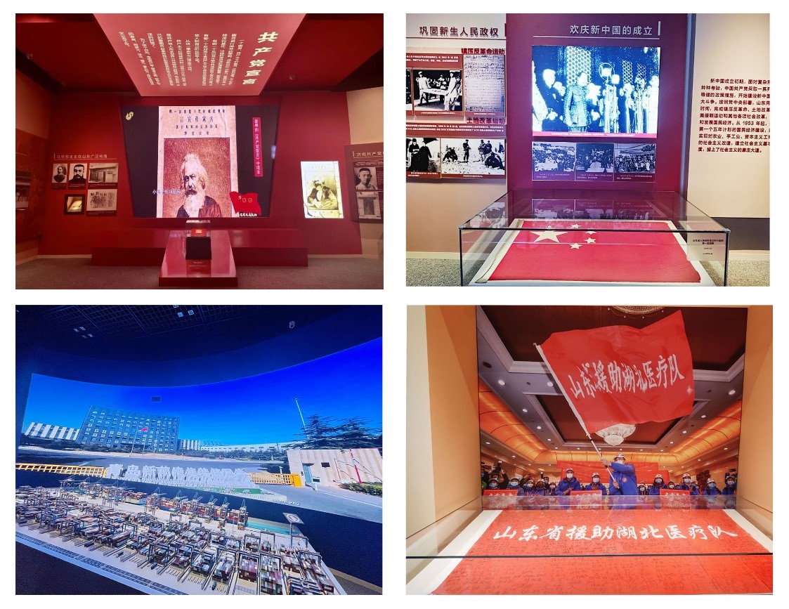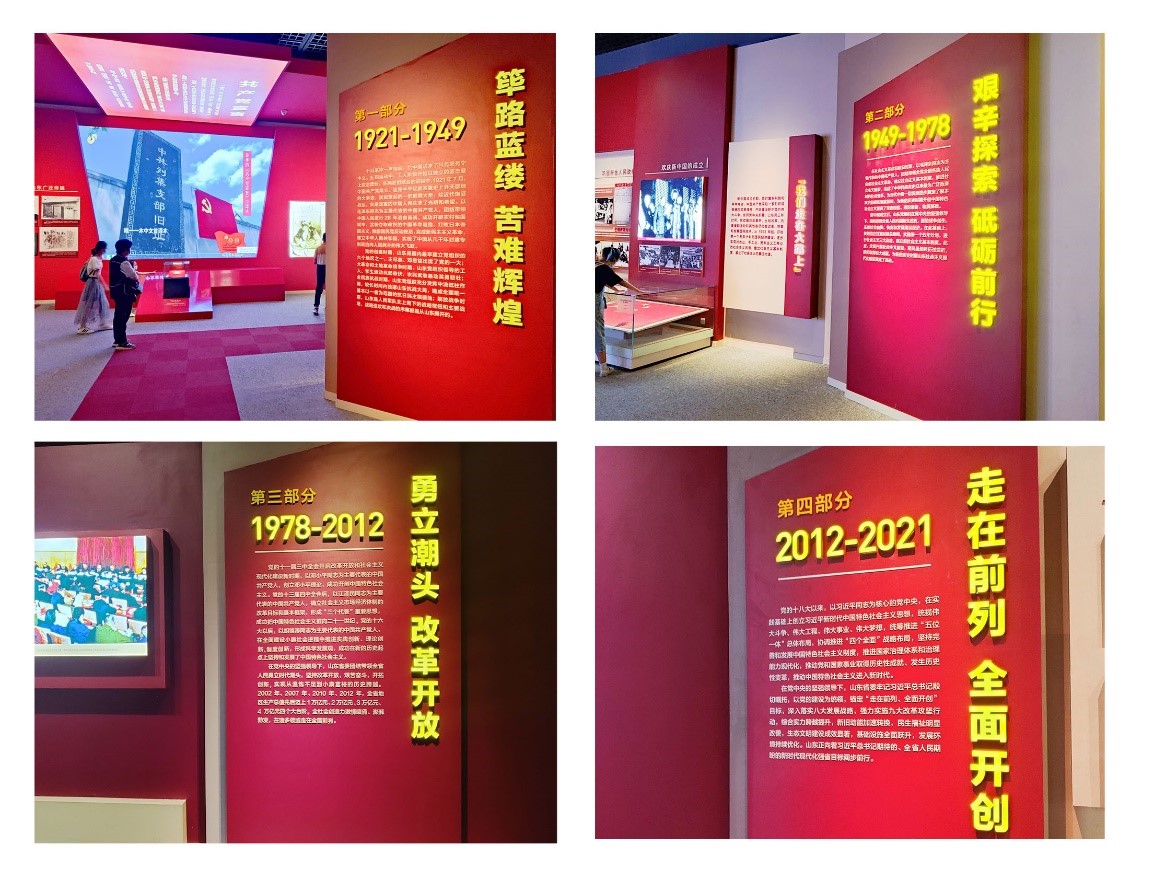 观展期间,大家逐一参观了“筚路蓝缕 苦难辉煌(1921—1949)”“艰辛探索 砥砺前行(1949—1978)”“勇立潮头 改革开放(1978—2012)”“走在前列 全面开创(2012—2021)四个展区。通过530余幅图片、210余件(套)文物实物、50余项500余条音视频及多媒体展项,集中展示中国共产党成立百年来特别是党的十八大以来,在党中央坚强领导下,山东党组织团结带领全省人民取得的历史性成就、发生的历史性变革,充分展示山东党组织在党的领导下的践行初心使命史、不懈奋斗史、自身建设史、政治锻造史。