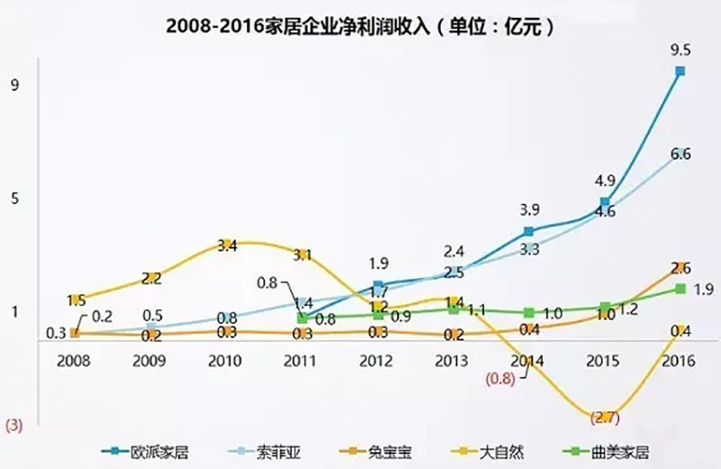 供给侧改革、“一带一路”政策、工业4.0的发展加速家居家装全产业创新升级,家居产业持续稳定增长。为了全面了解家居产业整体发展情况,亿欧智库整理橱柜、衣柜、板材、地板、软体家具等领域代表企业2016年营收及净利润的相关数据得出: