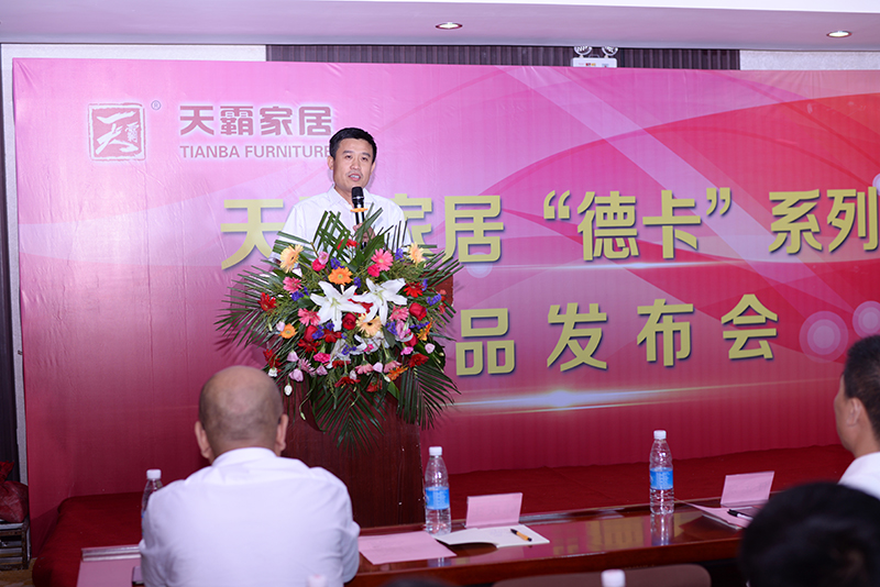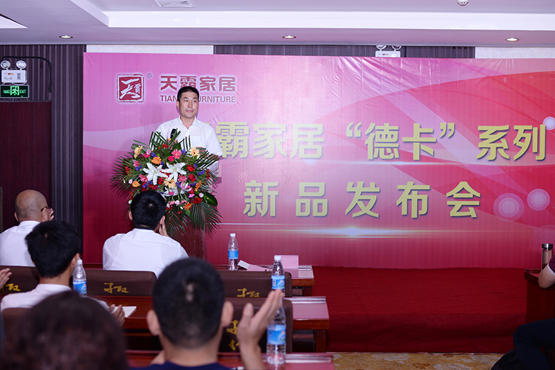 天霸家居总经理任运泉先生也发表讲话,他首先对经销商多年支持的表示感谢,介绍了“德卡”系列产品的设计初衷、定位和优势,表示天霸家居将一如既往的大力支持合作伙伴。