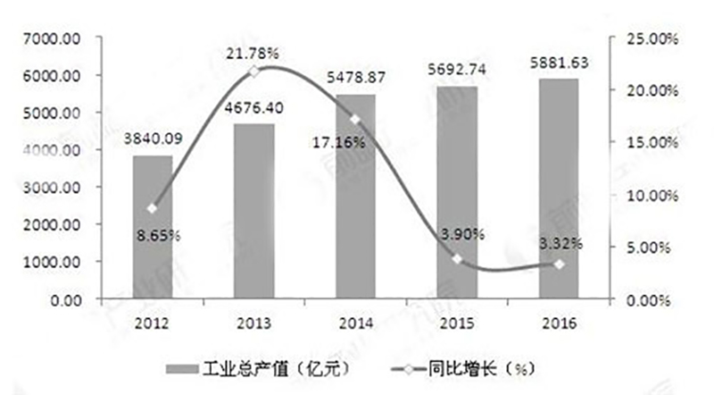 2012-2016年门窗行业工业总产值及增长率走势(单位:亿元,%)