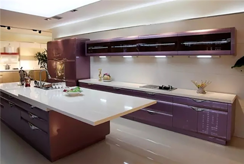 水晶板由基材加白色防火板加亚克力制成,在欧洲比较流行。它取代了传统的玻璃笨重易碎、伤人等缺点外它有很多优点。小作坊的厂家,用的是有机玻璃,规范的厂家用的是压克力,环保、造型立体。这种厨门丰硕了橱柜的设计,起到了积极的作用。缺点是表层容易脱落,影响美观,表面容易划伤,在常温空气中会发生氧化而变色,光泽度保持时间短。