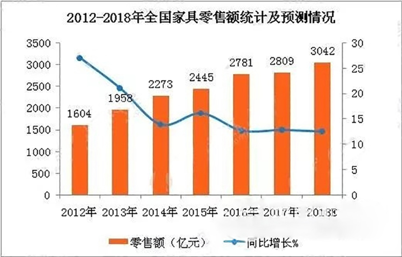 从2012-2017年间,我国家具类零售整体保持平稳增长趋势。2012-2017年全国家具类零售额持续增长,2017年零售总额达2809亿元,相比2016年的2781亿元增加了28亿元,根据预计,2018年全国家具类消费将继续保持稳中有长趋势,预计2018年全国家具类零售额将突破3000亿元。