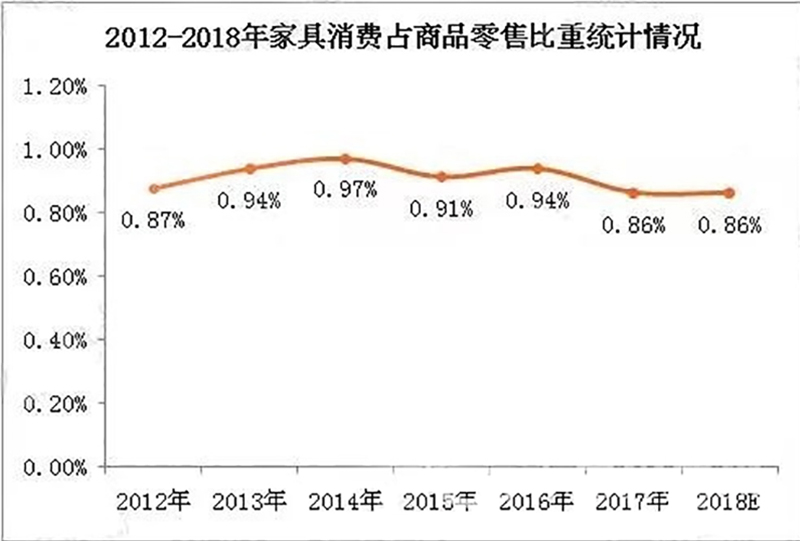 2017年我国商品消费总额为326618亿元,同比增长10.2%。经统计整理,2012-2017年家具类消费占商品零售比重相对稳定,比重基本维持在0.9%左右。预计2018年家具类消费在商品零售中占比会在0.86%左右。