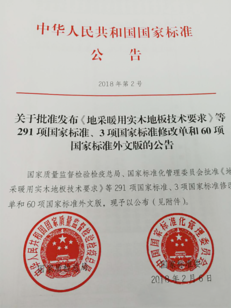 2018年2月7日,由国家林业局提出,国家质量监督检验检疫总局、国家标准化管理委员会批准的《地采暖用实木地板技术要求》国家标准,在北京质检总局327会议室正式发布。本标准起草工作由中国林业科学研究院木材工业研究所、浙江菱格木业有限公司、浙江柏尔有限公司主要负责,浙江格尔森木业有限公司、久盛地板有限公司、苏州好宜家木业有限公司、浙江方圆木业有限公司等多家企业共同参加标准起草。