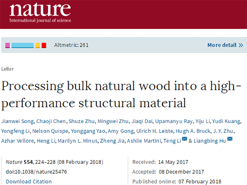 2月8日,Nature在线发表了美国马里兰大学胡良兵教授和李腾教授研究团队关于超级木头的最新发现。该研究团队发明了一种简单有效的方法可以把原生木材直接处理成为一种超强超韧的高性能结构材料。