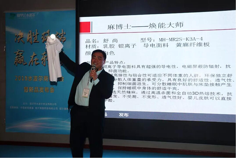 总经理戚圣睿为经销商朋友们解析2018年水波尔新品,水波尔2018年众多新品的升级及床垫功能性、智能化的体验,赢得了经销商朋友们的热烈欢迎。经销商朋友也现场体验了水波尔新品,感受了科技与智能带给人们更加科学、优质的睡眠。