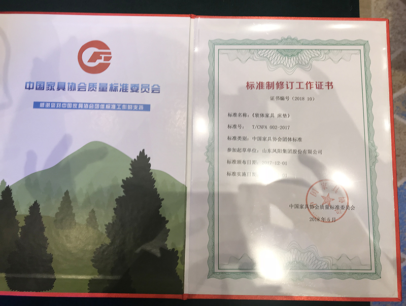 会议中,中国家具协会软垫专业委员会为《软体家具床垫———中国家具协会团体标准》参与制定单位颁发工作证书,烟台吉斯家具集团有限公司,山东凤阳集团有限公司荣获中家协“软体家具 床垫”标准制修订工作证书。