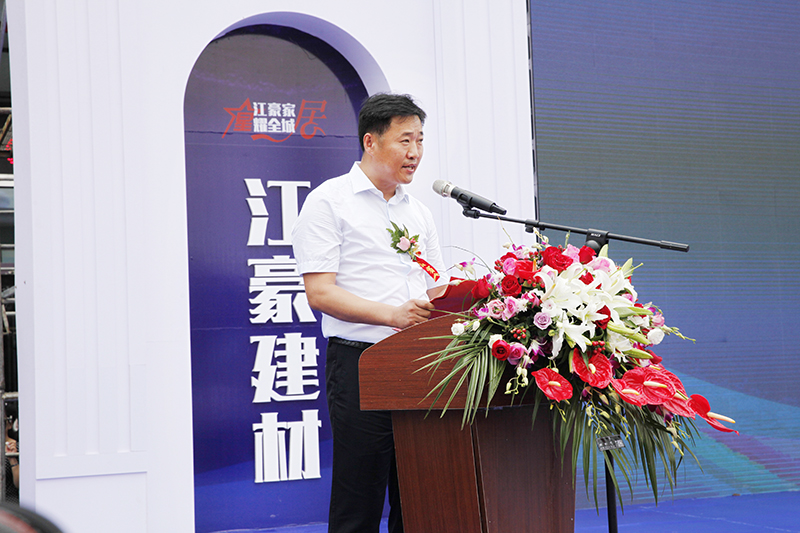 江豪集团董事长路奎江致辞,路董回顾了江豪建材家居城创建13年的光荣历程,感怀各级党委政府的正确领导和大力支持、感谢1500名业主一路同行,感激全体后楼人凝心聚力。同时,展望了江豪集团的美好未来。