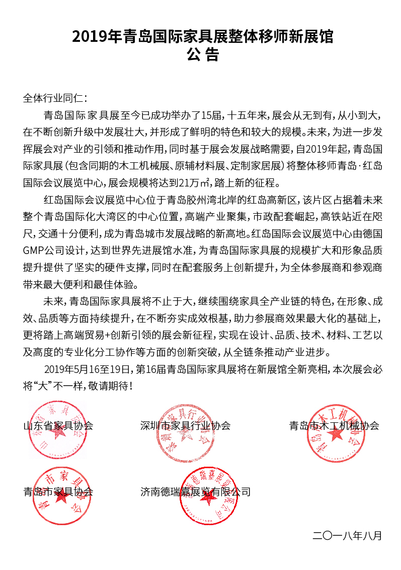 8月24日,青岛国际家具展主承办单位联合发布公告称,自2019年起,青岛国际家具展(同期:全屋定制、木工机械及原辅材料展)将整体移师青岛·红岛国际会议展览中心举办,届时展会总规模将达到210000㎡,举办时间为2019年5月16-19日。