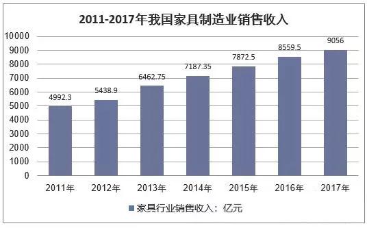 回顾2012-2017年家具制造业营业收入情况:近六年来,我国家具制造业营业收入保持稳步上涨,但2013-2016年,我国家具制造业营业收入增长速度逐年下降,2017年增速却意外反弹,提高0.5个百分点。