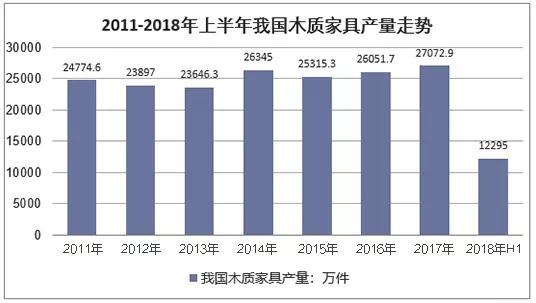 2016年我国木质家具产量为26051.7万件,2017年我国木质家具产量为27072.9万件,2018年上半年我国木质家具产量为12295.0万件。