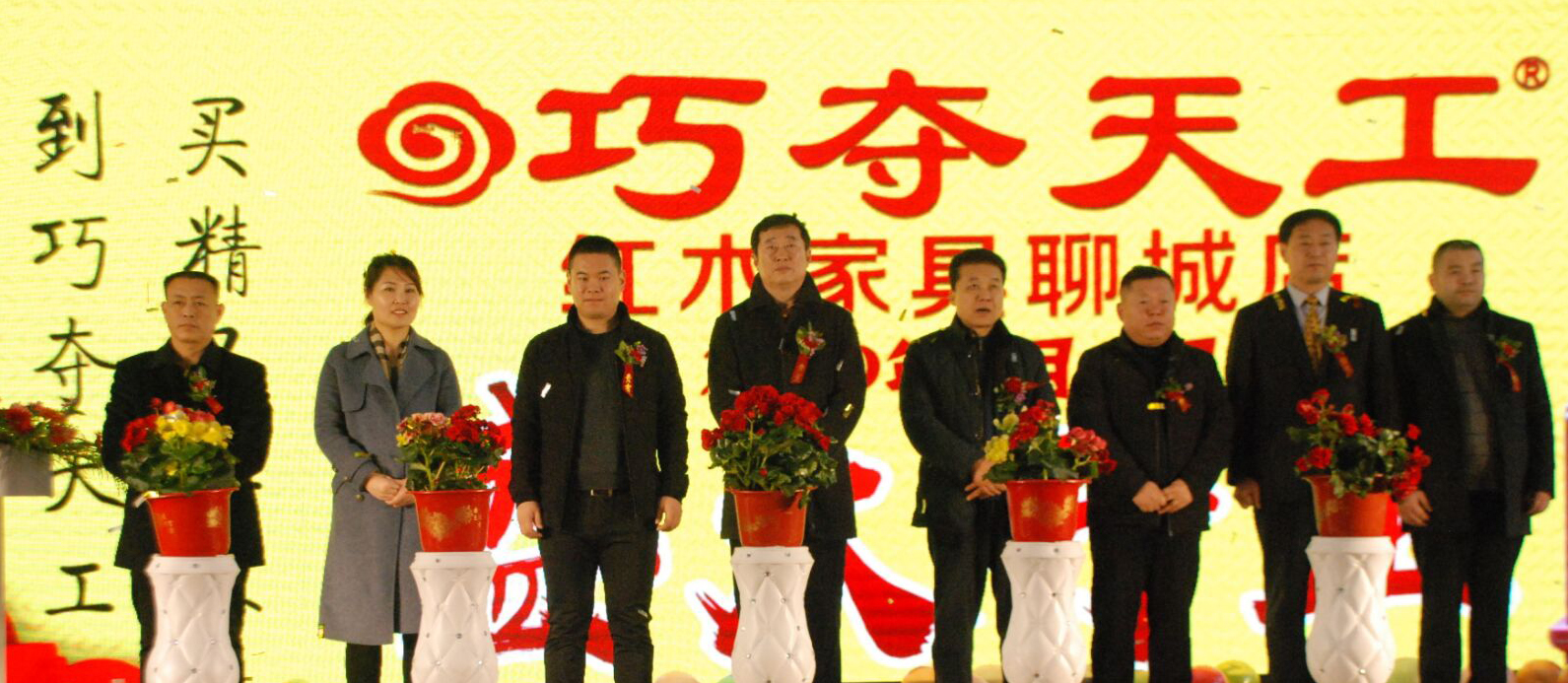 星美家居生活广场总经理孙红敏、山东众合建材有限公司总经理秦道亮、巧夺天工忠实客户孟庆国、巧夺天工聊城店负责人刘国强、巧夺天工总经理张爱明、聊城地区新老客户、红木爱好者及各媒体代表等200余人出席本次开业庆典。