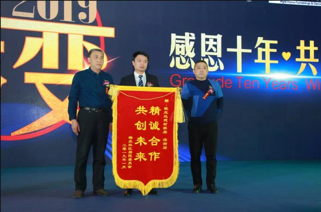 北园街道杨庄社区党委书记/居委会主任张洪刚,将写有“精诚合作 共创未来”的锦旗赠予欧亚达控股集团副总裁彭成,标志着欧亚达建材家居济南北园店与杨庄社区继续精诚合作,携手共进,谱写新的篇章。
