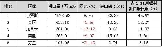 表2:2018年1-11月我国进口锯材累计排名前五位的来源地