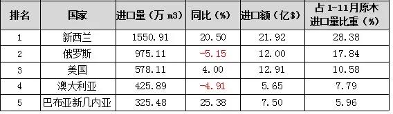 表1:2018年1-11月我国进口原木累计排名前五位的来源地