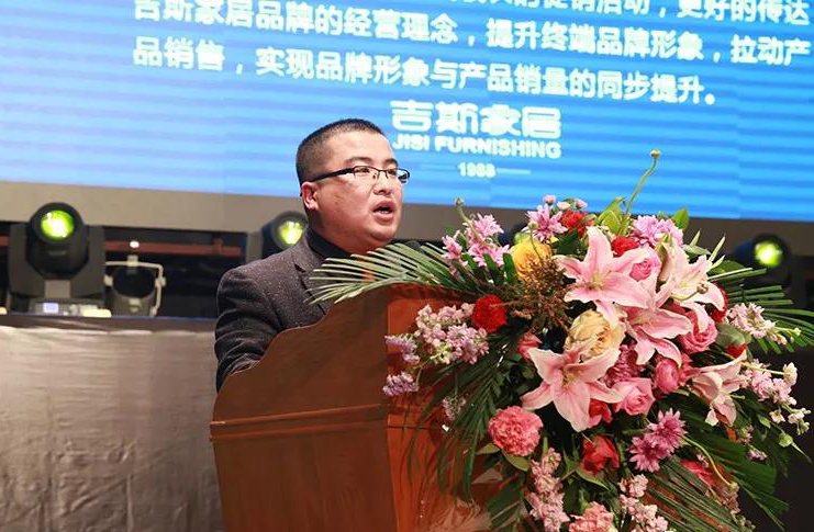 烟台吉斯家具集团有限公司董事长孙杰致欢迎词,感谢30多年来经销商的支持和信任,吉斯有责任也有义务为经销商提供更多的优良产品和优质服务,共同赚取更多的市场地位和市场份额,不负“成人达己,成己为人”这一使命。