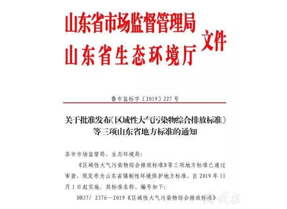 6月25日,山东省政府新闻办公室称,《区域性大气污染物综合排放标准》(DB37/2376—2019)、《工业炉窑大气污染物排放标准》(DB37/2375—2019)、《钢铁工业大气污染物排放标准》(DB37/990—2019)3项地方标准已通过审查,现发布为山东省强制性环境保护地方标准,并于2019年11月1日起实施。