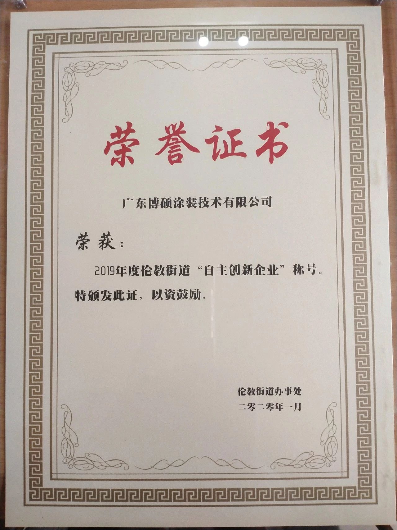 1月14日,广东省佛山市顺德区伦教政府举行了“伦教街道2019年度工作总结暨村改总攻动员会”,会议主要围绕2019年度政府工作总结及2020年政府工作规划,全体政企共聚一堂共同促进伦教的大发展。广东博硕涂装技术有限公司荣获伦教街道“自主创新企业”称号。