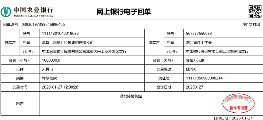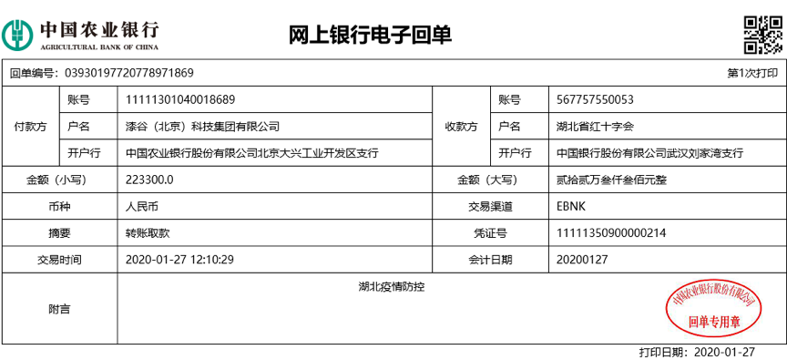 1月25日,疫情出现后,名士达公司一直高度关注并迅速采取措施积极应对,公司各部门员工纷纷自愿自发提出向疫区捐助,同时得到了全国客户的积极响应,在三天内已共同捐助“疫情防控款”合计122.33万元,并已于1月27日(大年初三)由漆谷(北京)科技集团有限公司统一电汇至湖北省红十字会捐助账号,用以购买救援物资,与武汉人民共抗疫魔。
