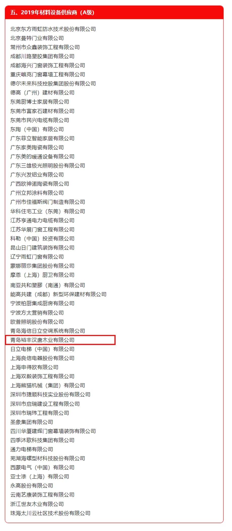 2月12日,万科通过万科周报向社会发布2019年合格供应商名录,青岛裕丰汉唐木业有限公司(优菲家居)再获万科材料设备A级供应商殊荣。自2013年起,我公司已6年荣登万科A级供应商之列。