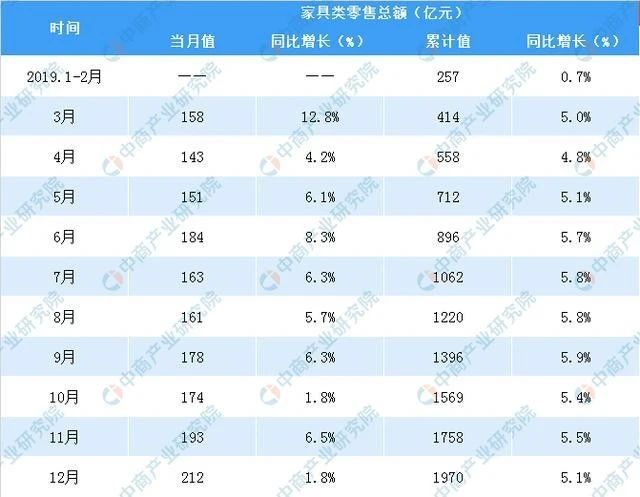 另据国家统计局统计数据显示,2019年12月,全国家具类零售额达为212亿元,同比增长1.8%;2019年1-12月,全国家具类零售额为1970亿元,与上年同期相比增长5.1%。