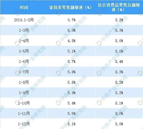 2019年,社会消费品零售总额411649亿元,比上年名义增长8.0%。从增速来看,2019年全国家具类零售额同比增长5.1%,低于同期社会消费品零售额2.9个百分点。