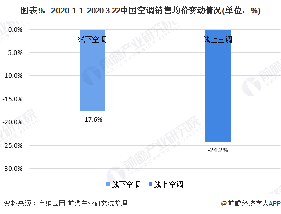 根据前瞻产业研究院的分析,2020年新冠疫情爆发,加上新能效标准出台的双重压力,中国空调行业继续下行。根据奥维云网的监测数据显示,2020年截至3月22日,中国线下空调销量下滑56.5%,线上空调销量下滑24.8%。在销量持续走低的同时,空调价格也持续走低,2020年截至3月22日,累计线下空调均价同比下降17.6%,累计线上空调均价同比下降24.2%。