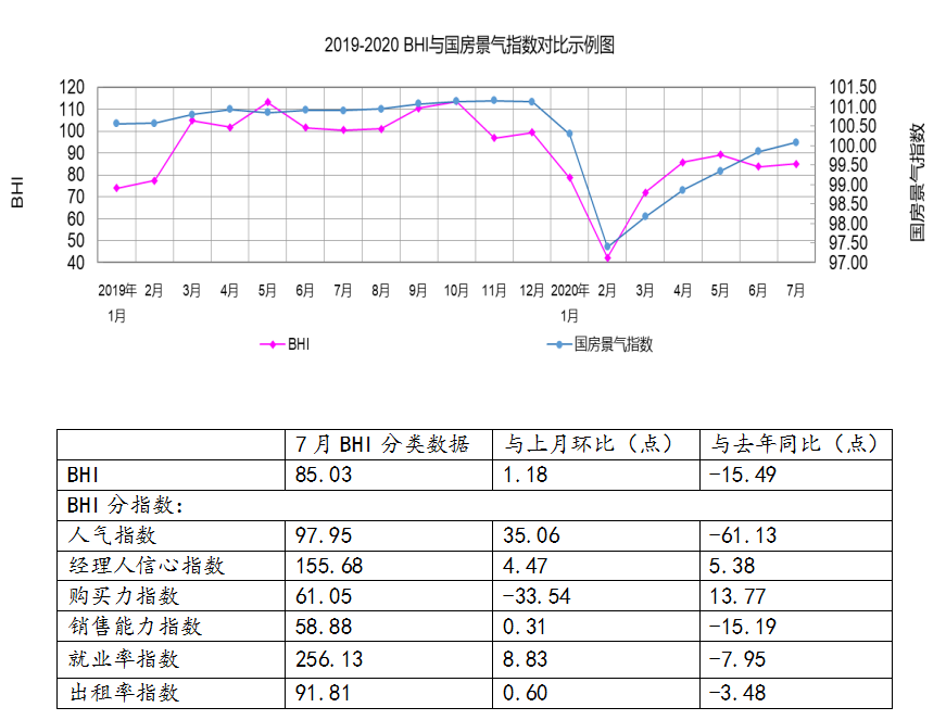 首先,分析7月全国房地产市场:2020年上半年全国楼市政策相对宽松,市场整体逐渐走出疫情影响,部分城市升温过快,房价过快上涨的热点城市开始在7月陆续出台调控收紧政策,加上前期积压的需求逐渐释放,市场重回理性,7月全国楼市整体正常回落,稳中微降。据国家统计局数据显示:1—7月份,商品房销售面积83631万平方米,同比下降5.8%,降幅比1—6月份收窄2.6个百分点;商品房销售额81422亿元,下降2.1%,降幅比1—6月份收窄3.3个百分点;7月份,房地产开发景气指数(简称“国房景气指数”)为100.09,比6月份提高0.24点。