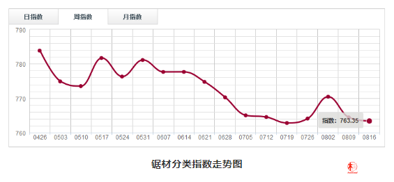本周锯材分类指数延续下滑态势,报收763.35点,环比下跌0.14%。其中鱼珠锯材指数、大西南锯材指数分别收跌0.07%、0.85%;福人锯材指数、南康锯材指数分别上涨0.16%、0.01%。