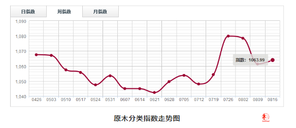 经历过前两周较为明显的震荡行情之后,本周原木分类指数走出了触底反弹的走势,虽然在成交额方面还不尽人意,但盘面的翻红却也提振了木材商家的经营信心。根据中国木材价格指数网监测数据显示,本周原木分类指数报1063.99点,周环比涨2.65点,涨幅0.25%,成交量环比增加1.26%,交易额下滑0.12%。