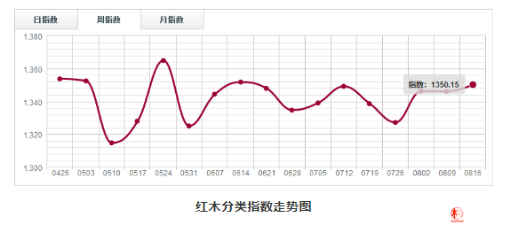 宏观经济回暖带动木材市场经营信心的修复,促使市场对后市基本面预期有所改善。本周红木分类指数整体形势较上周相对较好,周指数环比上涨0.31%,报收1350.15点。其中上海福人和四川大西南本周指数分别上涨了0.77%、0.73%;广东鱼珠市场周指数微跌0.47%。