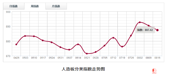 在外围市场缺乏新利因素的提振下,本周人造板分类指数继续绿盘调整,报收887.42点,跌0.34%。其中鱼珠人造板、福人人造板指数分别上涨0.01%、0.09%;大西南人造板指数、临沂人造板指数分别下跌1.39%、0.05%。