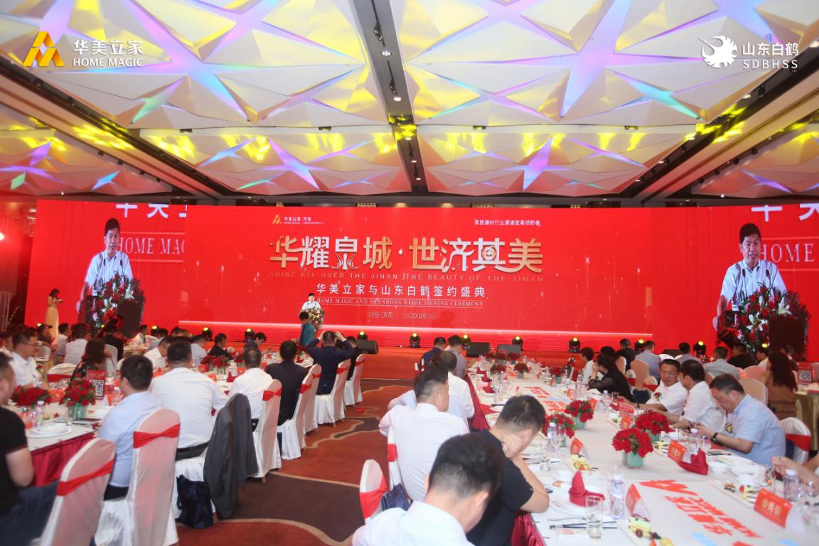 9月6日,“华耀泉城 世济其美”——华美立家与山东白鹤签约盛典在济南举行。济南市天桥区政府常务副区长韩利师、中国建筑材料流通协会副会长兼秘书长张彩虹、中国家居品牌联盟秘书长文锋、山东省家具协会执行会长牛广霞、华美立家集团董事长贾锋、华美立家商管有限公司总裁张志良、山东白鹤集团董事长杨恩英、山东白鹤集团总经理秦秀菊等嘉宾,以及来自全国数百家知名家居品牌商家代表、合作伙伴、主流媒体500余人共同见证此次盛会。