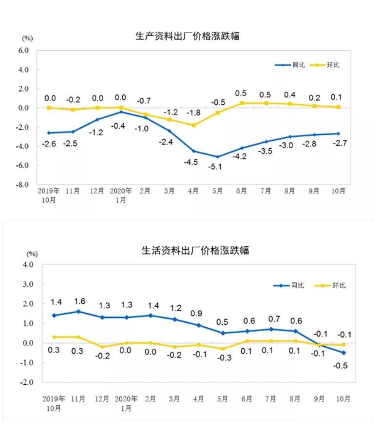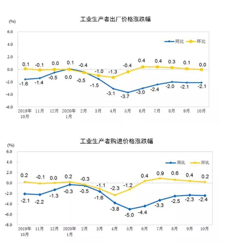2020年10月份,全国工业生产者出厂价格同比下降2.1%,环比持平;工业生产者购进价格同比下降2.4%,环比上涨0.2%。1―10月平均,工业生产者出厂价格比去年同期下降2.0%,工业生产者购进价格下降2.6%。