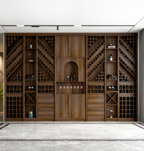 北美胡桃色的华贵与铝合金的清冷相遇,奢华且坚韧;细腻自然的木质纹理与棕色表层倾心相拥,内敛的酒窖与典雅的空间相得益彰,尽显尊贵格调。