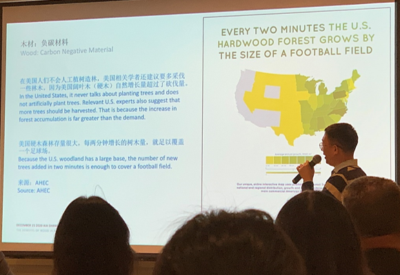 美国阔叶木外销委员会东南亚及大中华区处长陈席镇表示,今年九月,中国在联合国大会上提出2060年实现碳中和的承诺,被誉为是过去五年来全球气候政策最重要的里程碑。中国房产开发商、建筑师、室内设计师和工程师越来越需要在他们的项目中考虑碳排放。作为长久合作伙伴,美国阔叶木外销委员会与美国建筑师学会一直围绕可持续发展以及如何将美国木材用于室内、建筑设计和建筑结构,以减少对环境的碳排放为目标进行合作。让更多建筑师、设计师、工程师等专业人士了解美国阔叶木低碳环保以及可持续的特点,将来可以在更多的建筑和室内设计应用中使用到木材,让可持续的生活方式真正进入大众生活。