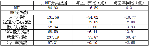 由商务部流通业发展司、中国建筑材料流通协会共同发布的全国建材家居景气指数BHI 1月份全国建材家居景气指数(BHI)为84.93,环比下降16.59点,同比上涨6.31点。全国规模以上建材家居卖场1月销售额为755.5亿元,环比下降8.59%,同比上涨25.45%。