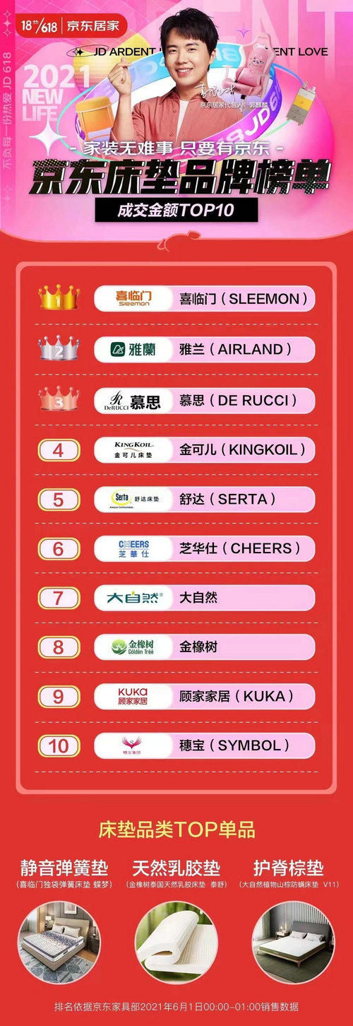 辛苦一整天,最向往的事情就是躺在床上美美的睡上一觉,影响睡眠体验的核心产品床垫开场销量火爆。前10分钟,大家争分夺秒去下单,其中静音弹簧垫、天然乳胶垫、护脊棕垫这些具有精细化功能的床垫更受消费者青睐,成为床垫品类TOP单品。大品牌号召力继续在线,舒达、丝涟、席梦思等床垫国际品牌成交额同比增长150%,喜临门、雅兰、慕思位居床垫品牌成交额TOP3,雅兰更是前10分钟超去年全天成交。好睡眠有助于孩子成长发育,宝爸宝妈为孩子抢购床垫的热情高涨,儿童床成交额同比增长115%,儿童床垫成交额同比增长150%。
