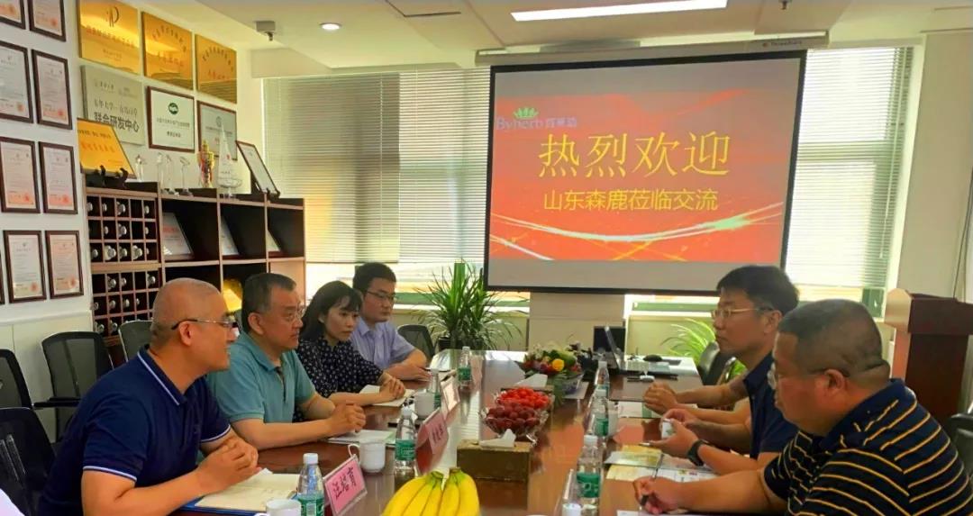 7月14日上午,森鹿皮业董事长董新志、常务副总谢桃信、技术副总冯国立、汽车内饰分公司总经理林程等四位领导走访百草边大生物科技(青岛)有限公司。百草边董事长黄效华、总经理汪培育等公司管理层全程接待。