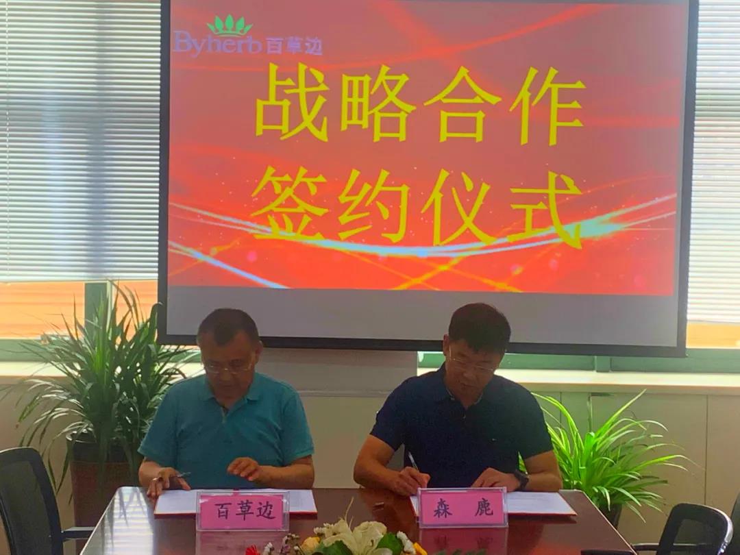 交流会结束后,举行签约仪式,黄效华董事长、董新志董事长分别代表百草边与山东森鹿签署战略合作协议。