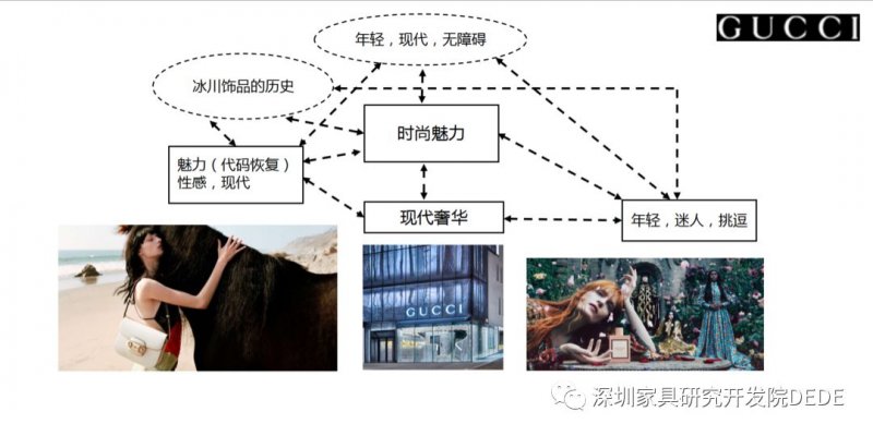 在国际时装界,品牌诞生或重新定位时,甚至可以在传达产品属性之前直接进入价值观阶段;如:奢侈品或豪华配饰的品牌,可以立即定向传达到“意识世界”,而不是简单的产品属性集。