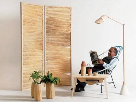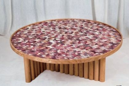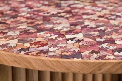 墨西哥设计师把不同颜色的玉米壳碾碎平铺,再黏合到纤维板上,用镭射切割的方式,设计出玉米塑料贴面的茶几(下图)。