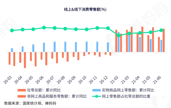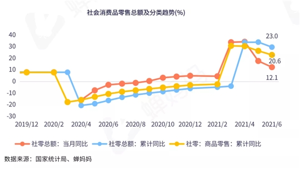 2021年6月社会消费品零售总额(以下简称社零)增速趋稳,当月同比增长12.1%,增速较5月的12.4%低0.3个百分点,消费品市场总体保持较好增长态势。线上方面,受去年高基数影响导致累计同比增速延续下降态势,1-6月网上商品和服务零售额累计同比降至18.7%。不过,从线上零售占比来看,受618电商年中购物节的驱动,6月线上零售占比继续上调,达23.7%。整体来看,6月线上表现略优于线下。