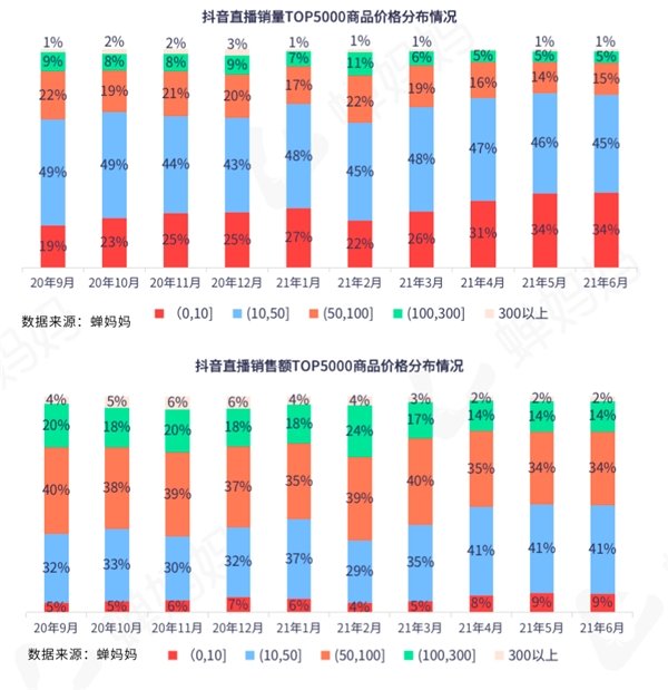 下图为2020年9-2021年6月抖音直播月销售额前5000名和月销量前5000名商品的价格分布。从销量TOP5000商品分布情况来看,由于抖音对下沉市场的渗透加大,加之新入局抖音直播者越来越多,“秒杀引流”玩法日渐常态化,客单价0-10元的商品占比自4月以来均超30%;此外,从各梯队的商品占比变化来看,近3个月各梯队的商品占比趋于稳定,具体来看,客单价在0-10元的商品占比由4月的31%微幅上调至6月的34%,客单价在10-100元的商品占比由4月的63%微幅下调至6月的60%,客单价在100元以上的商品占比维稳在6%。