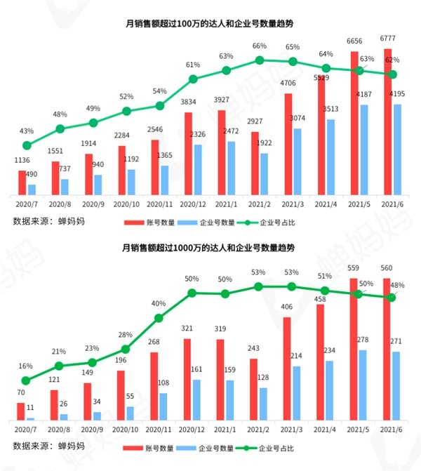 取品牌自播+短视频品宣策略,探索线上转化新路径。但是,从达人带货月榜中企业号用户数占比来看,月销售额超过100万的账号中,抖音企业号用户数占比自2021年2月触达66%的高点后持续微幅下调,6月抖音企业号用户数占比为62%;月销售额超过1000万的账号中,抖音企业号用户数占比自2021年2月触顶后亦承压下行。整体来看,目前无论是头部主播达人,还是腰部达人(月销售额超过100万),企业号占比均处于高位回调阶段,且仍未出现结束迹象。