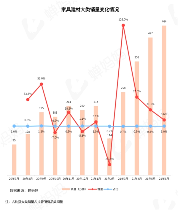 在抖音直播间购买家具建材已经成为常态,经历过618抖音好物节,更是加速了家具建材行业的快速增长。蝉妈妈深度研究2021年6月家具建材行业数据,梳理了家具建材行业值得关注的六大直播电商趋势,发布了这份抖音电商行业数据报告,以飨读者。