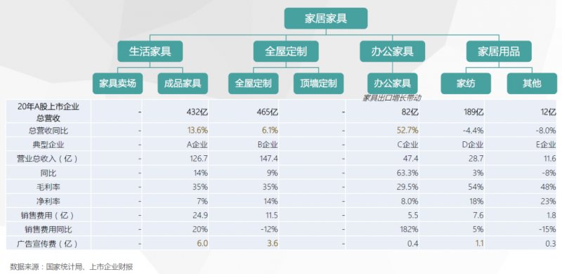 统计局数据显示,2020年我国家具类零售总额达1598亿元,同比上年下降7%;就上市企业营收看,成品家具、全屋定制及家纺的规模较大,且成品家具及全屋定制在2020年的营收逆势上涨。
