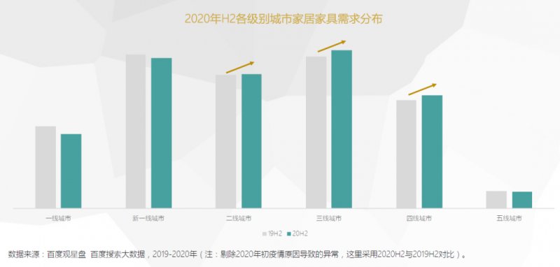 一线、新一线城市进入存量时代、三四线城市属于增量市场。一二三线城市的家居家具需求占八成;2020下半年,二三四线城市检索需求同比呈增长态势,三四线城市需求增速快于二线城市。