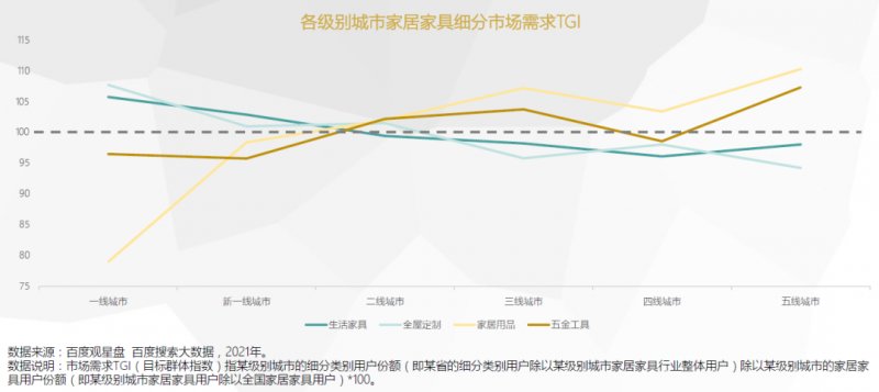 一线、新一线城市的全屋定制、生活家具等“大件”的需求明显高于三四线城市;二线、三线、四线及五线城市在家居用品及五金工具等“小件”的需求明显高于生活家具及全屋定制。